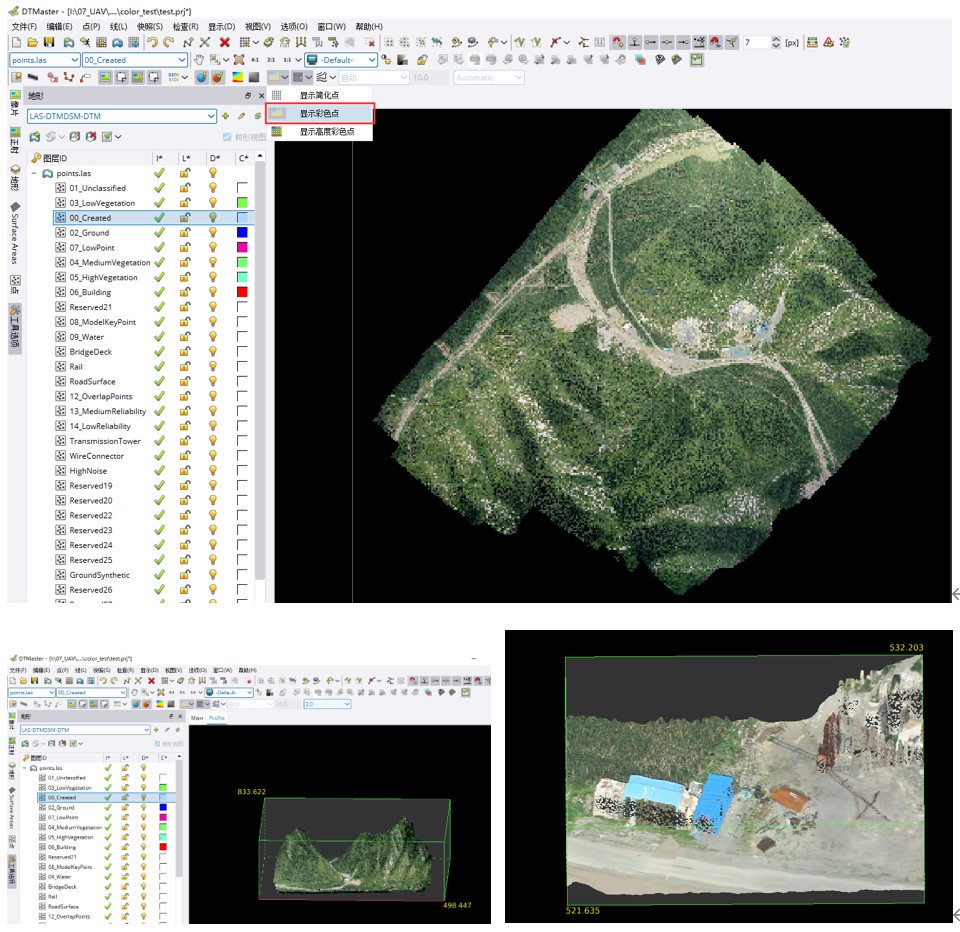 将渲染着色后点云加载至DTMaster模块中质检。选择“显示彩色点”选项,即可浏览着色后的点云。